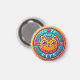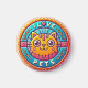 Crachá ao estilo cartoon de cor brilhante com um gato feliz.