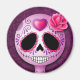 Este adorável crânio roxo é decorado com espirais tribais e gotas com um grande coração no meio da testa. Uma rosa-rosa-solteiro fica do lado do crânio redondo logo acima dos grandes olhos pretos. Os pedais violetas rodeiam os olhos e a boca tem pontos que fazem subir o lado da bochecha. O crânio está sobre um fundo roxo profundo criando um belo contraste. Este design de ímã é um exemplo amável deste Dia dos Mortos.