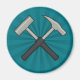 Esta imã de geladeira geológica apresenta um par de martelos de rocha cruzados sobre um fundo de explosão solar. Abaixo está um ponto para o seu nome ou mensagem curta em texto branco.