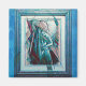Um trabalho de arte apresenta uma mulher semimabstrato com um xale/véu em tons azuis, brancos e cor-de-rosa.