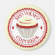 Um ímã com ilustração de um cupcake de veludo vermelho com dentro de gelo branco um círculo decorativo vermelho e branco com texto vermelho.