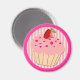 Fundo listrado rosa e branco. Cupcake cor-de-rosa com aspersão de fuschia e um morango no topo.