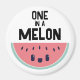 Um imã bonito, kawaii com uma fatia adorável de melancia com olhos sujos e um sorriso doce. Acima da fatia de melão estão as palavras Um em um melão em letra negra.