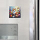 This magnet has a cute whimsical colorful folk art cat sitting in flowers and surrounded by butterflies done in an impasto style.