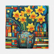 A.I. A interpretação criada de um buquê vibrante de daffodils amarelos destaca-se contra um pano de fundo de formas geométricas surreais e cores ousadas. O intricado vaso com padrão abriga as flores.