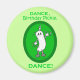 Um design engraçado apresenta um picle dançante torturado com uma vela de aniversário iluminada perigosamente encolhida na cabeça. O texto diz: "Dança, picada de aniversário, dança!" Fundo verde com desenho de caneta de tinta.