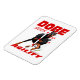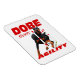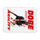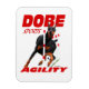 Dobermann preto enérgico nos postes de tecelagem com o logotipo Dobe Sports em um ímã fotográfico flexível.