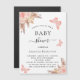 Para um convite de chá de fraldas magnético estilo boho moderno. Um fundo branco na frente. Decorados com ouro rosa e flores, rosas, erva-pampas e borboletas cor-de-rosa. Personalize e adicione um nome e detalhes da parte.