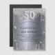 Um moderno, na moda e glamouroso ímã de convite para uma festa de aniversário 50. Um fundo com aparência de prata falsa, decorado com poeira brilhante. Personalize e adicione seu nome e detalhes da festa. O número 50 é escrito com uma fonte de estilo balão, script.