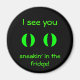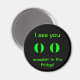 Esta é uma imã de geladeira redonda preta com olhos verdes néon nela e as palavras "Eu vejo você, esgueirando na geladeira!" É divertido gótico que se mistura bem com o Halloween. Tenho que manter o controle com todos aqueles doces escuros.