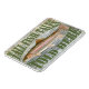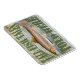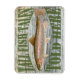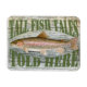 Um ímã decorativo para o pescador na sua vida. "Contos de peixes altos contados aqui" com uma imagem detalhada de uma truta arco-íris em um fundo de madeira curada rústica.