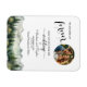 Uma elegante Imã salve a data de Casamento com montanhas de aquarela e pinheiros e uma foto especial que você pode personalizar com seus detalhes.