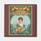 Arte retrógrada para o Royal Muslin, que inclui uma mulher em trajes vitorianos e ramos de maçãs e peras num fundo de deco artístico