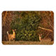 Este ímã flexível de arte apresenta um nascer de sol de manhã cedo com dois veados-de-cauda-branca-marrom (odocolleus virginianus) que têm dormido ao pé de uma árvore verde-verde-verde. Seus olhos, pescoço e cauda são brancos. A floresta está formigada com luz laranja.