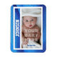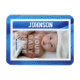 Comemore o nascimento do seu lindo bebê imortalizando-o no primeiro cartão de beisebol dele. Basta adicionar a foto do seu bebê e editar o primeiro e o nome do meio, além do nome da equipe, que também é o sobrenome da família. A borda do cartão magnético é uma imagem de tecido de malha azul comumente usada em uniformes esportivos.
