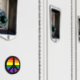O arco-íris preenche uma forma de símbolo de paz preto.