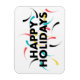 Design gráfico moderno e lúdico de um ditado "Felizes Feriados" com formas geométricas circulares coloridas em abstração de confetti em cores vermelha, amarela, azul e preta. Tipografia urbana.