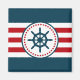 Design náutico com decoração das rodas de vela em forma redonda com estrelas sobre fundo listrado vermelho, azul e branco