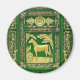 Fotografia de um tradicional carro cigano pintado com um cavalo de ouro sobre fundo pintado verde, fotografado na feira de cavalo Appleby, em Cumbria, Inglaterra, onde ciganos se reúnem todos os anos.