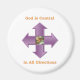 Setas 3D apontando em cada direção com o Deus de Michelangelo da Capela Sistina no centro Texto no topo lê "Deus é Central" Texto na parte inferior lê "Em todas as direções"
