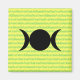Nomes de deusa - Isis, Astarte, Diana, Hecate, Demeter, Kali, Inanna - se repetem ao fundo. Seus nomes estão em uma fonte verde clara sobre um fundo amarelo pálido. Na frente está o símbolo da Deusa Tripla