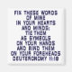 Conserte estas minhas palavras em seus corações e mentes; amarre-as como símbolos em suas mãos e as amarre em suas testa. Deuteronomia 11:18