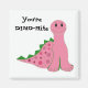 Um dinossauro cor-de-rosa com pontos cor-de-rosa e uma cauda verde-espinhosa. Um grande sorriso no rosto dela. Diz "Você é Dino-mite"