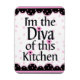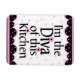 Um ímã giro para o padeiro em sua casa. Ele tem um fundo espiralado cor-de-rosa e branco com cor de rosa e preta para baixo. Diz que sou o Diva desta Cozinha. Muito fofo.