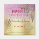 Folha de na moda, elegante, única, dourada, que incorporou a silhueta flamingo em combinação com um adorável fundo rosa brilhante e dourado e com folhas gigantes de palma tropical de ouro. Trendy, moderno, adorável aniversário de 16 anos doce - Imã salve a data. Você pode personalizar facilmente todos os elementos de texto ou gráficos - aproveite e faça a melhor combinação possível!