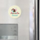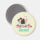 Um imã que diz: "Doce". Projetado com um tema de sorvete doce. Ilustrado com um bar de sorvete de chocolate, sundae de 3 colheres com uma cereja no topo, e um float de morango com creme chicoteado. Pequenos morangos e cerejas ao longo do fundo. Fundo amarelo pálido. Refrescando curativos de tempo quente.