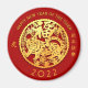 Cortado em papel chinês ouro de um tigre fofo + ideograma de Fu que significa Fortune (modelo n°1) num círculo + pequeno ideograma de Tiger chinês + Feliz ano novo em chinês e inglês e grande 2022. Design sobre ímã redondo com fundo vermelho. Você pode mudar facilmente a cor do plano de fundo e o ano (fonte, cor, tamanho e posição) clicando no botão personalizar. Cartão de saudação e cartão postal. Perfeito para um Ano Novo Chinês moderno e eterno do Tigre 2022.