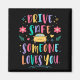 Warm reminder message with colorful hand lettering on a dark background. A gentle and emotional phrase that encourages safe driving and shows care, love, and connection for family, friends, and loved ones.