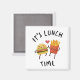 Que horas é o almoço? É hora do almoço. Hambúrguer engraçado e batata frita apaixonados. Uma combinação perfeita para crianças e adultos.