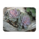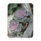 Este ímã apresenta bonito suculentos crescendo em um pedaço de madeira.