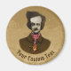 Edgar Allan Poe, aterrorizado, a ver um inseto de ouro a subir na gravata. Desenho colorido da caneta de tinta. Texto personalizado em círculo.