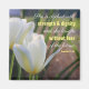 Fotografia de tulipa branca macia e amarela com Proverbs 31:25, Ela é vestida com força e dignidade.