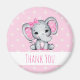 Um obrigado que você imprime com uma ilustração de aquarela de elefante rosa e giro. Ela tem orelhas bonitinhas, cor-de-rosa e bolinhas branca e arco bonito de fita rosa sobre a cabeça. O plano de fundo é rosa claro com bolinhas coloridas creme.