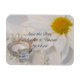 Personalize o bonito Casamento de margarida elegante Salve o ímã de data com os nomes pessoais da noiva e do noivo e a data específica da cerimônia de casamento para anunciar seus próximos núpcias. Este belo casamento botânico personalizado mantém o ímã de datas com uma fotografia floral digitalmente melhorada de um florescimento branco de margarida, colar branco de pérolas e princesa quadrada cortada em anel de noivado de diamante.
