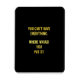 Texto amarelo sobre fundo negro questiona humoramente a praticidade de ter tudo. Leva o leitor a considerar os limites do espaço e da posse.