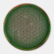 Enquadrada com madeira, esta bola redonda de azulejo de pedra tem musgo crescendo entre ela e a estrutura de madeira.