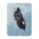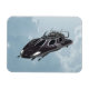 Renderização digital 3D de uma espaçonave escura sobre fundo azul