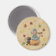 Este ímã bonito tem um espantalho sentado numa abóbora grande com o gato preto ao seu lado. As folhas do outono estão caindo ao seu redor.
