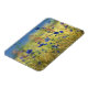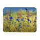 A chicória azul vívida e as flores de milho florescem num campo ouro de grama sob um céu azul pálido. O fundo loiro e verde também é interrompido pelo cintilante rosa das flores de capim-comum.