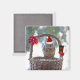 Foto de um esquilo fofo vestindo um chapéu de Papai Noel sentado em uma cesta decorada com um arco de Natal vermelho e verde, enquanto a neve cai ao redor dela. Combustos verdes de uma árvore verde podem ser vistos no fundo e a neve está se acumulando. Uma bela foto de esquilo para ajudá-lo a celebrar o Natal!