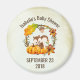 imã salve a data de evento de chá de fraldas com um esquilo giro parado atrás de algumas abóboras cor de água laranja. Uma coroa foliar rodeia-os com uma folha de carvalho e flores laranja e outros ramos e folhas. O fundo é uma cor creme, com um olhar áspero envelhecido à volta das bordas.