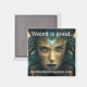 Mulher estranha e surreal com legenda "estranho é bom".