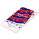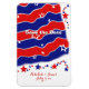 Um design patriótico vermelho, branco e azul com linhas onduladas e estrelas. Personalizar texto.
