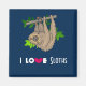 Um desenho bonito de uma preguiça-marrom agarrada a um galho com folhas, pendurada de cabeça para baixo. Adoro preguiças escritas por baixo.