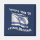 Não fique apenas com Israel; fique em Israel. Possui uma bandeira israelense. O texto em inglês abaixo da bandeira diz: "I STAND IN ISRAEL." O texto hebraico acima da bandeira diz, "Ani omed b'Yisrael" (א נ ע ו מ ד ב י י ש ר א). Venha para casa, faça aliyah. Junte-se àqueles que eram nasceres aqui e àqueles que vieram para casa. Não há mais maneira de mostrar o vosso apoio a Israel do que de se tornarem cidadãos e viverem aqui.