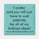 Desfeche a sua gagueta no seu frigorífico, no seu armário de ficheiros e em qualquer outro sítio onde possa colocar um ímã! Texto: Eu garanto e vocês vão ter que esperar pacientemente por todas as minhas ideias brilhantes! Sobre um fundo verde-marinho (a cor da consciência arrebatadora).